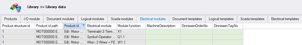 The library data window is a very useful window to quickly access all attribute data from the library. When a library is expanding, managing attribute data can be challenging. The library data window can assist you with this challenge. The library data window is divided into several tabs. In this way, you can manage and edit attribute data for each products, modules or templates. On the I/O module tab it is also possible to edit and import/export the I/O type and I/O symbolic and texts.