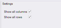 It is also possible to bypass the attribute filters by selecting the ´Show all columns´ or ´Show all rows´ checkboxes in the settings detail panel.