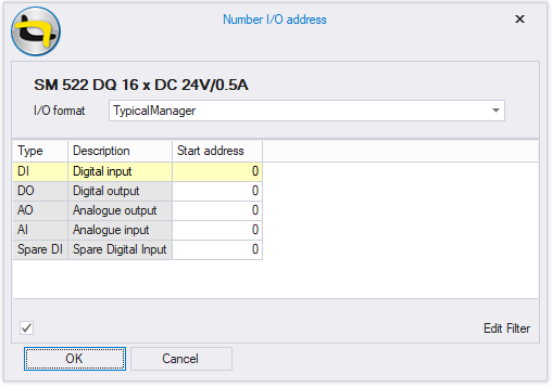 For automatically address all the I/O, you must select a CPU (usually at the begin of a rack) to address all I/O on all units or just one I/O unit to only address the I/O on that unit. With the button 'Address' a pop-up window shall appear. Here you can choose an I/O format and optionally you can fill in the start addresses. If you have selected a CPU, the start addresses are already filled in from the library.
