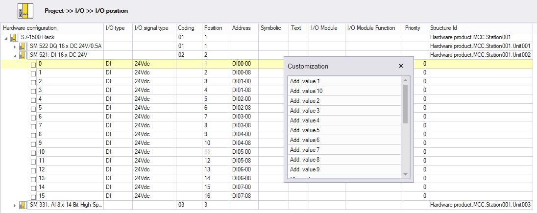 It is possible to add a terminal and additional values to I/O types and I/O signal types that are linked to an I/O Unit or I/O CPU. Additional values can be used in various situations to store additional data per I/O channel. Examples of additional values: