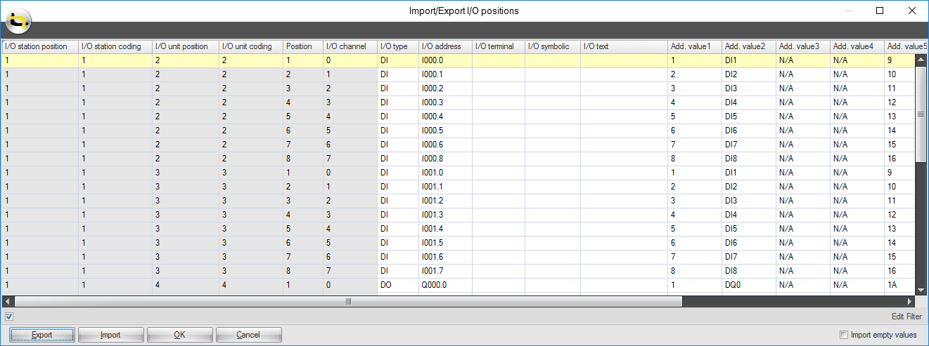 After dividing all the project I/O, the I/O can be addressed. This can be done automatically or manually one by one. It is also possible to import the I/O addresses ('Import/Export' button).