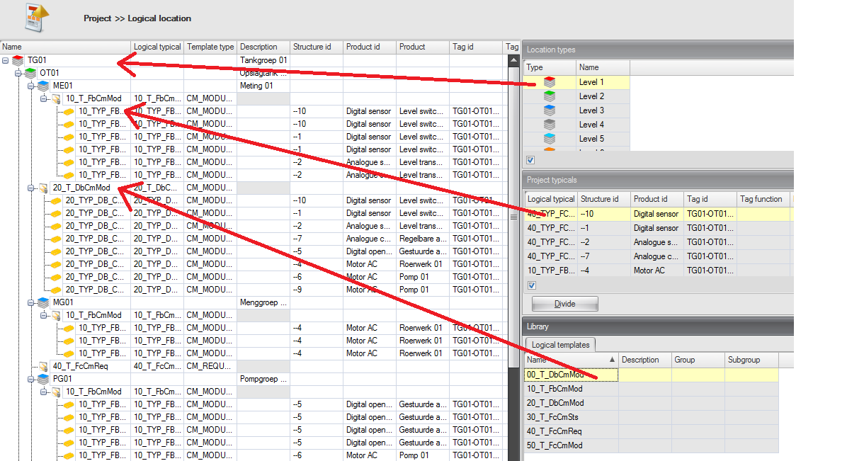 It is possible to create a tree like structure and place all the project Typicals automatically. Therefor you need to configure a logical location format and select this location format in your project settings. After that, you can use the Divide button to divide all the project Typicals. You can choose if you want to divide all the Typicals or only the selected Typicals. For more information about automatic dividing we refer to organizing automatic divide.