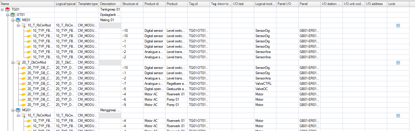 While generating the tree, the typicals connected to the templates will be placed in the template typical and the variables will be filled with data. The typicals of location ‘Production line 1’will be collected by template 'PLC Code' of this location. The typicals of location ‘Process cell 1’ will be collected by template 'PLC Code' of this location.