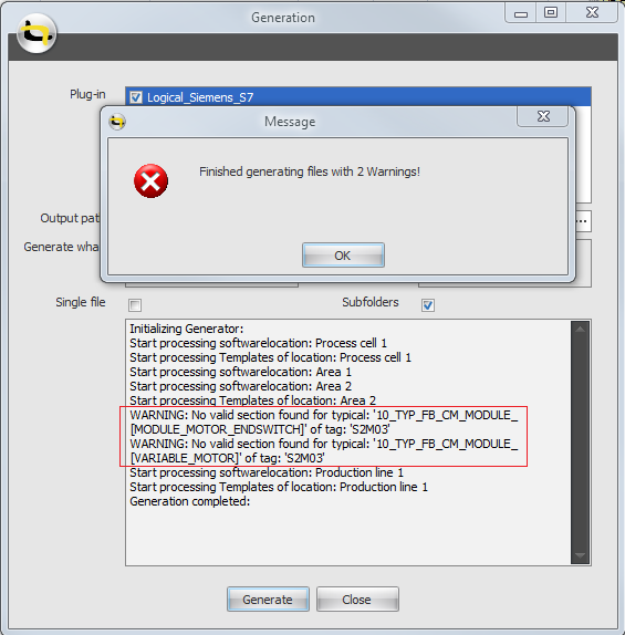 In case software generation fails, a message dialog' Error generating files!' will appear. There can by multiple causes why software generation fails. The most common are: